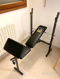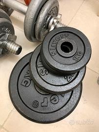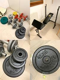 Il lotto comprende pesi, asta bilanciere, 4 manubri con chiusura a vite e panca in omaggio