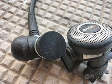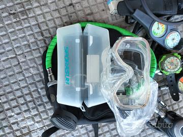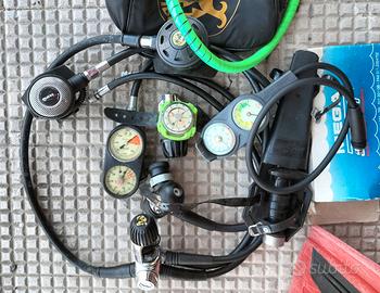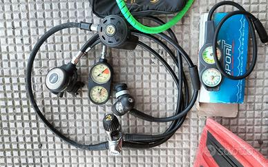 Lotto per immersioni sub con bombola: - Erogatore Spiro Technisub con consolle ( da cambiare) attacco int e fruste per muta stagna. Usato da fare revisione fermo da 10 anni. -Erogatore Mares mr12 serie abyss attacco Din ,fermo da 10 anni ,da fare revisione - consolle Mega sport nuova mai usata profondimetro e manometro - Bussola subacquea - due adattatori int e din -grosso coltello sub - maschera per bombola Spora sub in silicone ,nuova mai utilizzata ,se trovo altro materiale lo aggiungo . L'erogatore Poseidon che si intravede non è incluso, è in vendita a parte. Preferisco ritiro a mano , nel caso vi regalo una cintura zavorra con tasca e molti kg di piombo