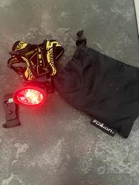 lampada frontale Fusion™ con luce rossa e blu corredati di sacchetto per il trasporto nero.