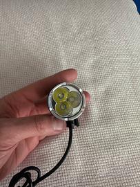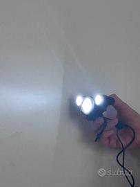 Vendo due luci MagicShine, la prima con tre obbiettivi a led con singole personalizzazioni, il led centrale, le due piccole esterne o tutto insieme e tenendo premuto il pulsante con filo separato alla luce si può regolare l intensità della luce e pacco batteria molto potente.