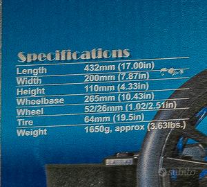 Radiocomando 2 canali, Trasmissione cardanica, Telaio anodizzato in alluminio da 2,5 mm, Sospensioni regolabili, Motore Pro 18BX (3.0cc.), Cambio a due velocità.