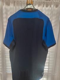 Maglia Allenamento Rugby Fir Italia. Realizzata da Macron in poliestere di colore blu sulle spalle e le maniche e la parte centrale della maglia è in blu royal. Loghi federazione italiana e sponsor applicati. Sul retro tono s tono la scritta ITALIA.