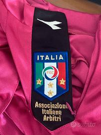 Maglia da arbitro Diadora per la Lega Serie A. - Colore fucsia. - Maniche lunghe. - Logo Diadora sul petto. - Stemma Italia e Associazione Italiana Arbitri. divisa ufficiale da arbitro Diadora per l'Associazione Italiana Arbitri (AIA), probabilmente della stagione 2011/2012 sul collo compare la scritta dell'assistente arbitrale Mauro Tonolini , si vede poco come in foto