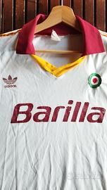 Maglia originale adidas AS Roma 1991 1992. Taglia credo L (etichetta presente ma non leggibile, misure 69 cm lunghezza dal collo e 56 cm larghezza ascella ascella). Nessuna personalizzazione. Maglia rara con segni del tempo, in particolare sullo sponsor Barilla ma in buone condizioni per una maglia di quasi 35 anni.