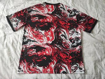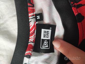 T-shirt sportiva originale New Era dei Chicago Bulls, taglia M. Presenta un'audace grafica a spirale (swirl) nei colori rosso, nero e bianco su tutta la superficie. Il logo dei Bulls è posizionato sul petto. Tessuto in 100% poliestere.