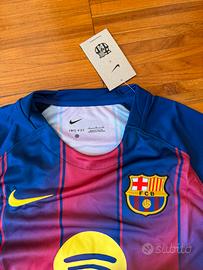 Maglia da calcio della squadra FC Barcelona con le iconiche strisce verticali rosse e blu. Sponsor Spotify in giallo al centro, logo Nike e stemma Barça sul petto. Tag presente, nuova. Un must per ogni tifoso catalano o collezionista. Taglia L.