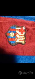 Stemma del Barça e logo Meyba ricamati, tessuto acetato brillante tipico delle divise ufficiali tardi anni ’80.