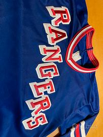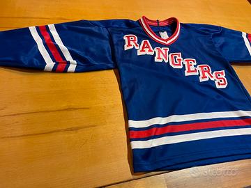 Vendo per collezionisti maglietta originale hockey su ghiaccio NHL dei New York Rangers anni 80/90 in buono stato, taglia bambino 10 anni.