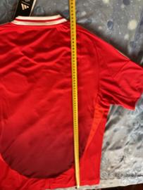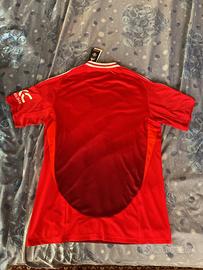 Vendo maglia da calcio del Manchester United, taglia L. La maglia è rossa con dettagli arancioni e presenta il logo dello sponsor Snapdragon. È nuova