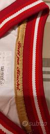 Colletto a V, impreziosito da tre righe bianche e rosse che riprendono i colori della bandiera nazionale.