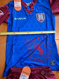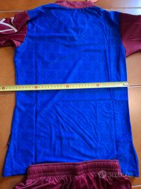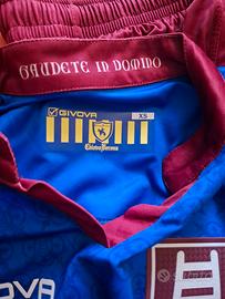 Completo da calcio del Chievo Verona, taglia XS. Include maglia, pantaloncini e calzettoni. - Maglia blu con inserti bordeaux. - Pantaloncini bordeaux con dettagli blu. - Calzettoni blu con righe bordeaux.