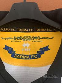 Maglia Erreà dell’ Associazione Calcio Parma. Versione casalinga. La tradizionale maglia crociata è legata all’iniziativa “Il tuo nome in crociato” che permise agli abbonati di apporre il proprio nome sulle casacche dei calciatori. - Design maglietta crociata - Sponsor Navigare sul petto. - Sponsor Folletto al centro. - Logo Errea e stemma del Parma. - Logo Lega SerieA - Tessuto tecnico. -Taglia L Maglietta mai usata