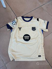 •Descrizione: Maglia away del FC Barcelona stagione 2025/26 in elegante color oro. Sponsor Spotify frontale e stemma Barça tono su tono. Include la patch Champions League sulla manica e il simbolo del Black Mamba in onore di Kobe Bryant.