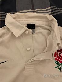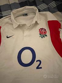 maglia originale Nike della Nazionale Inglese di Rugby, versione storica con sponsor O2 e stemma della rosa inglese ricamato sul petto.
