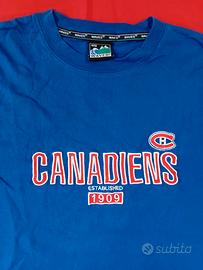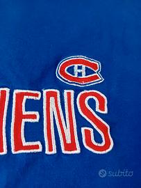 Maglia t-shirt a maniche lunghe dei Montreal Canadiens una delle squadre più rinomate di Hockey su ghiaccio del Canada. I Canadiens de Montréal sono una squadra canadese di hockey su ghiaccio, con sede a Montréal, Québec, che gioca nella lega professionistica nordamericana, la National Hockey League. I Canadiens sono inseriti nella Atlantic Division della Eastern Conference. La maglia riporta al centro il logo della squadra e la scritta della squadra. Sulle braccia due righe bianche. Maglia 100% cotone. Sull'etichetta il nome della marca Waves Canadian Graphics West Inc. Taglia M (Media). Condizioni ottime tenuto conto del tempo può avere qualche imperfezione. Usata molto poco.