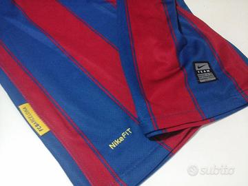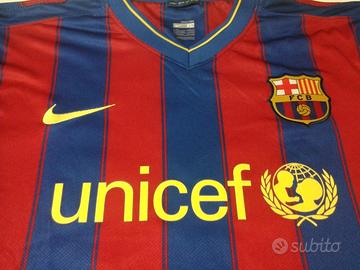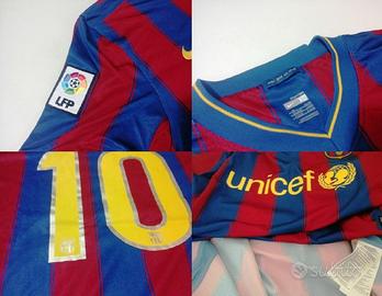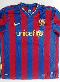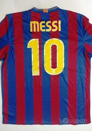 Come da titolo e foto, vendo la maglietta da calcio originale del Barcellona, stagione 2009-2010. La maglia a maniche corte è realizzata dalla Nike, dotata del sistema NikeFITDRY, riporta sul retro il numero 10 e la scritta Messi ma NON è stata indossata dal giocatore. La taglia è XL.
