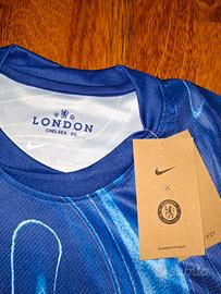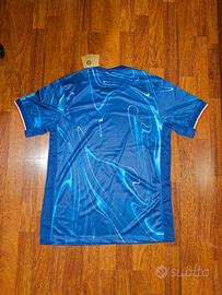 Questa è la maglia del Chelsea 🏟️⚽, caratterizzata da un design blu intenso 💙 con effetti fluidi elettrici 🔵⚡. Il logo del club 🦁 e i dettagli arancioni e bianchi 🔶⚪ sui bordi la rendono unica. Perfetta per i fan dei Blues 🔥💪!