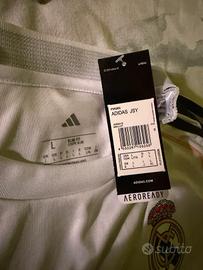 Maglietta del Real Madrid. - Colore bianco con dettagli dorati. - Logo Adidas e stemma del Real Madrid. - Sponsor Emirates Fly Better.