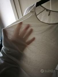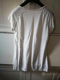 Maglietta mezze maniche da donna della decathlon, sintetica, aderente, molto leggera e quindi si potrebbe intravedere l'intimo, molto usata ma ancora in ottime condizioni. La taglia non si legge più ma a occhio potrebbe essere una M.