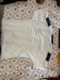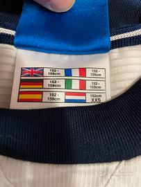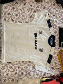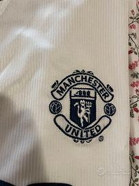 In vendita iconica terza maglia (Third Kit) del Manchester United della stagione 1999–2000, quella successiva al leggendario Treble, prodotta da Umbro. Capo 100% originale dell’epoca, non una riproduzione moderna. Autentico pezzo vintage football shirt da collezione. Caratteristiche principali Stagione: 1999/2000 Sponsor: SHARP (stampa originale dell’epoca) Personalizzazione: schiena pulita (no nome / numero) Taglia: Junior XL / Adult XXS (etichetta: 152–158 cm / 12–13 anni) Tecnologia: Vapa Tech (etichetta laterale originale presente) Autenticità: tutte le etichette interne originali Umbro Codice di produzione: 78/044 Condizioni Ottime condizioni vintage: tessuto ancora vivido, loghi Umbro e Manchester United perfettamente ricamati sponsor Sharp ben conservato Ideale per collezionisti, esposizione o per chi cerca una vestibilità Junior XL / Adult XXS. Vintage football shirt – collector item