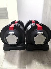 Manubri con selettore di peso da 3 a 24 kg ciascuno.