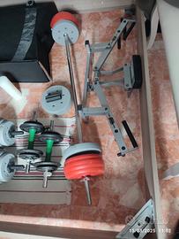 Set di manubri e bilanciere, con dischi rivestiti e non, più attrezzo per flessioni. In ottimo stato Vendo per inutilizzo.