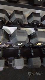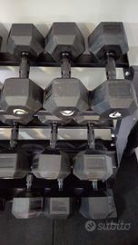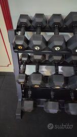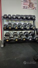 Vendo rastrelliera pro lacertosus insieme ai manubri esagonali lacertosus in ottime condizioni da 6 a 27,5 kg. MANCANO i 25 kg.