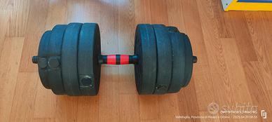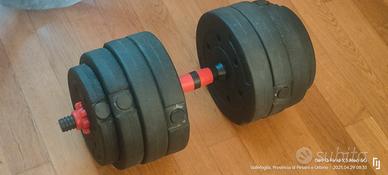 Vendo un manubrio regolabile con ghiere con 4 pesi da 3kg, 2 pesi da 2.5kg e 2 pesi da 1.25kg per un totale di 19.5kg più manubrio (circa 10kg per lato). Pagato 110 vendo a 40€.