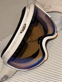 Maschera da sci Bollè Nevada, laccetto bianco e argento. Lente Light Vermillon Blue, semi-polarized, con filtro di categoria 2. La lente è anti-nebbia e anti-graffio, assicura una protezione 100% dai raggi UV. Prezzo da nuova: 150€