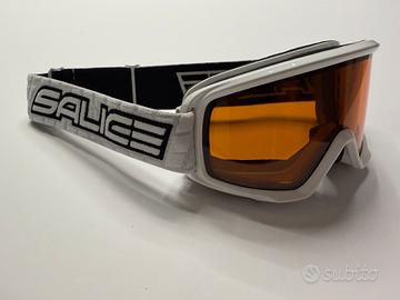 Maschera da sci Salice in ottime condizioni, montatura bianca lucida con elastico bianco/nero con logo.