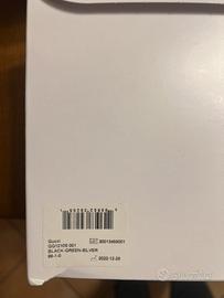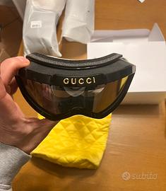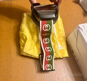 Stampo speciale, logo con scritta Gucci sulla parte superiore del frontale nero lucido con lenti color grigio scuro + specchio argento con fascia elastica unica tricolore.