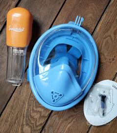 Maschera snorkeling Swonder, per bambini, usata solo 1 volta, quindi praticamente nuova e completa di tutte le sue parti originali, scatola compresa. La maschera copre completamente il volto, permettendo di respirare normalmente senza bisogno di boccaglio. Taglia 4-11 anni.