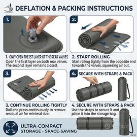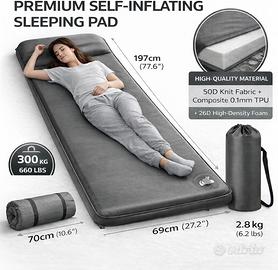 Materassino da campeggio professionale Roam Savage, modello top di gamma, NUOVO e mai usato. È la soluzione ideale per chi cerca il massimo comfort in tenda, camper o come letto d’emergenza in auto, senza dover gonfiare nulla a fiato o con pompe esterne. Punti di forza: • SISTEMA AUTOGONFIANTE: Grazie alla doppia valvola di precisione, si gonfia da solo in soli 60 secondi dopo lo srotolamento. • COMFORT "COME A CASA": Realizzato in Memory Foam ultra spesso (7 cm), sostiene fino a 300 kg. Dimenticate i sassi o le radici sotto la schiena. • ISOLAMENTO TERMICO R-VALUE 8: Uno dei pochi sul mercato con un isolamento così alto. Protegge dal freddo del terreno, dall'umidità e dal gelo (perfetto anche per campeggio invernale o in alta montagna). • MATERIALI TOP: Tessuto 50D ultra resistente, impermeabile e anti-strappo. • DESIGN INTELLIGENTE: Include cuscino integrato e clip laterali per unire due materassini e formarne uno matrimoniale. Specifiche tecniche: • Dimensioni: 197 x 69 x 7 cm • Peso: 2,8 kg • Colore: Ardesia Alpina (Grigio scuro) • Condizioni: Nuovo Disponibile per scambio a mano in zona Verona o spedizione