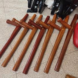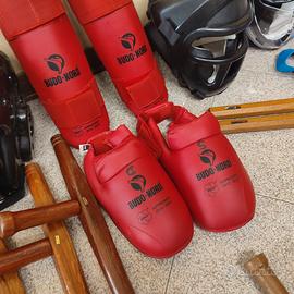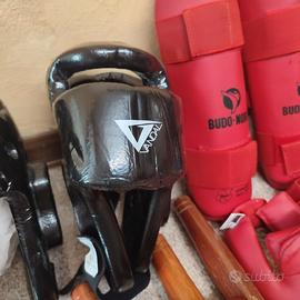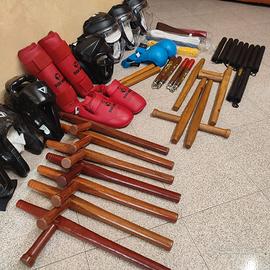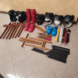 11 tonfa legno massello nuovi- 3 nunchaku legno con leggerissimi segni usura da trasporto- 5 nunchaku addestramento in gomma nuovi- 3 caschetti Vandal gomma nuovi-3 caschetti con visiera nuovi-1 casco con griglia nuovo-1 paratibie e parapiede rosso taglia piccola, nuovi- 1 paio guantini kumite taglia piccola nuovi- set di 8 cinture graduazione, nuove, in regalo.