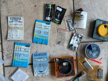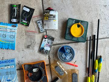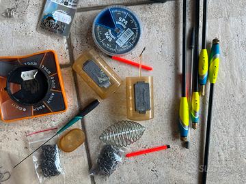 Materiale vario da pesca contenenteami girelle pasturatori piombi e alcuni galleggianti.