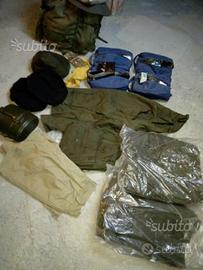 Materiale vario (gavetta, per pulizia personale, lucido per anfibi, zainetto tattico, ecc.) mimetiche abbigliamento militare originale vendo tutto in blocco unico.