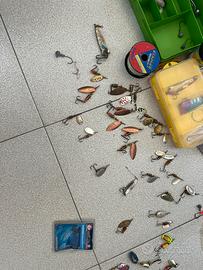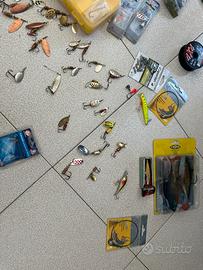Vendo vario materiale pesca soprattutto spinning rotanti Cucchiaini vibrax Cucchiaini martin Vermoni di gomma Rapala e pesciolini finali acciaio per luccio e predatori Ami piombi Galleggianti Regalo scatole