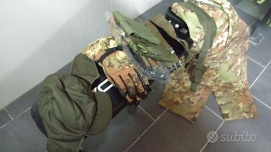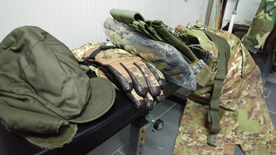 Gibernaggio , guanti in goretex pesanti , tasche sistema molle , cinturone , cappello passamontagna , giacca e pamtalone antivento in goeretex , surplus militari utili soprattutto in ambito softair o caccia.