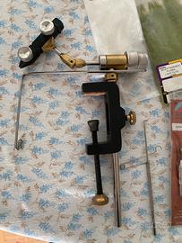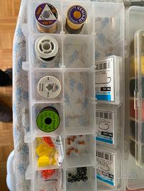 Vendo in blocco materiale vario per la costruzione di mosche artificiali (morsetto di costruzione , porta bobina , pinza dubbing , avvolgilenza , vari materiali di costruzione , piume , ami , ecc)
