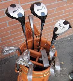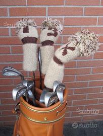Sacca da golf in ecopelle, con tasche, completa di ferri Wilson WS1000 n. 3-4-5-6-7-8-9; legni Wilson WS1000 n.1-3-5; 3 cuffie; putter McGregor ZP06; wedge Wilson WS1000; e con rain cover. Le mazze hanno l'impugnatura jumbo e sono adatte a persone di altezza 185/190 cm. Materiale in buone condizioni con piccoli segni d'uso, come da foto, causa inutilizzo vendo. Consegna presso la mia abitazione in Parma città, zona est.
