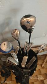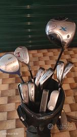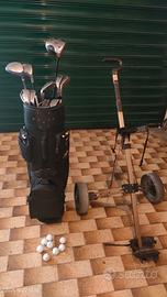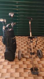set di mazze con sacca da golf e porta sacca richiudibile, usato per un paio di mesi, vendo per inutilizzo. tutto in buone condizioni come da foto. Non Spedisco.
