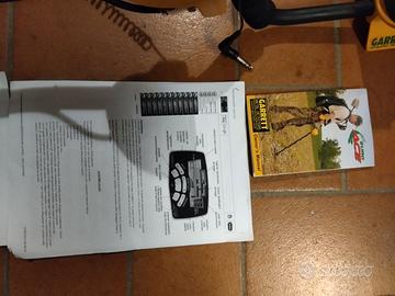 Accessoriato di custodia impermeabile originale per il display, cuffie originali, istruzioni per l'uso anche in italiano, paletta e rastrello non professionali ma funzionali su terreni morbidi, zaino non originale ma adatto al trasporto.