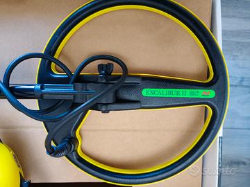 Minelab excalibur II modello recente per cui in perfette condizioni, usato con box montato posteriormente per cui immerso raramente, ultimo modello di carica batterie con indicatore di carica.