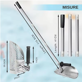 Pala forata professionale, progettata come ausilio per le ricerche in mare o spiaggia con il metal detector per il recupero degli oggetti. E' resistente alla corrosione ed ossidazione perchè realizzata in acciaio inossidabile di alta qualità. Dotata di un manico in acciaio inox divisibile in 3 parti con impugnatura finale in gomma. Strumento super leggero e molto resistente.