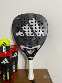 vendo fantastica racchetta adidas metalbone 3.4 ale galan 2025 in condizioni ottime. La racchetta presenta circa 3 mesi di utilizzo. Non ha alcuna crepa o graffio ma sulla testa come si può notare nell'ultima foto manca un piccolo pezzetto causa urto con parete. Per il resto i piatti sono perfetti. Viene data insieme a pesetti e chiave originale. Insieme do anche 3 tubi di palle adidas usate ma con circa 4 partite e due overgrip head. Per qualsiasi cosa chiedere pure in privato.