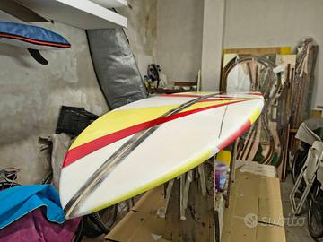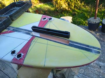 evolutiva con volumi generosi laminata 2+1 da 6once, bottom single concave, sistema pinne US box piu alette fcs classic; usata dal sottoscritto solo per prova