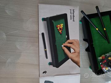 Vendo mini biliardo come da foto allegate. Lunghezza biliardo 25cm, corredato da due stecche e triangolo. Prodotto nuovo mai usato.
