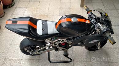 Minimoto con telaio GRC e motore bzm 50cc perfettamente funzionante e divertentissima da guidare. Corredata da carena da gara e da allenamento. Gommata. Insieme alla moto verranno date anche alcuni pezzi di ricambio e attrezzi per la manutenzione.