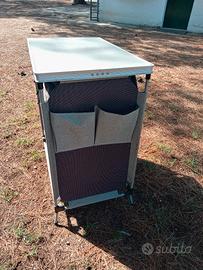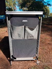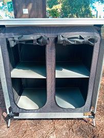 Mobiletto da campeggio CON.VER; 85cm (altezza); 74cm (larghezza); 46cm (profondità). Due ripiani di quattro scompartimenti; ripiani rimuovibili e chiusura cerniera; quattro tasche laterali. Se viene ritirato direttamente , il prezzo è 60 euro.
