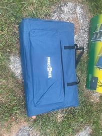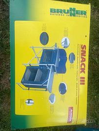 Mobiletto cucina con struttura in alluminio anodizzato e piano lavoro arrotolabile a tapparella. Con 2 armadietti pensili in tessuto di poliesteri di cui quello centrale dispone di un ripiano interno sempre a tapparella, 2 solidi ripiani laterali aumentano la praticità e versatilità. Montaggio semplice e rapido. Completo di paravento e borsa custodia.
